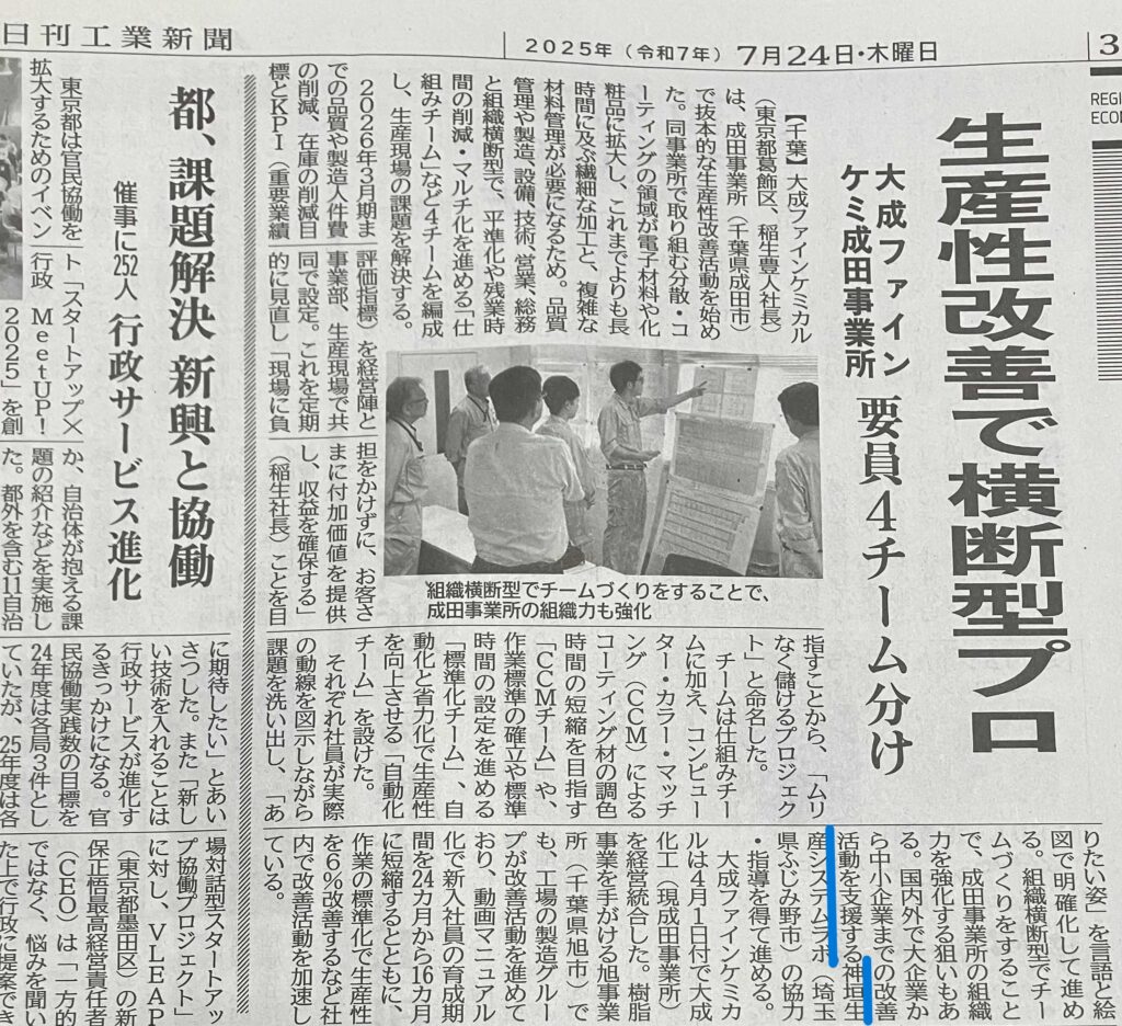 Article on productivity improvement activities published in Nikkan Kogyo Shimbun