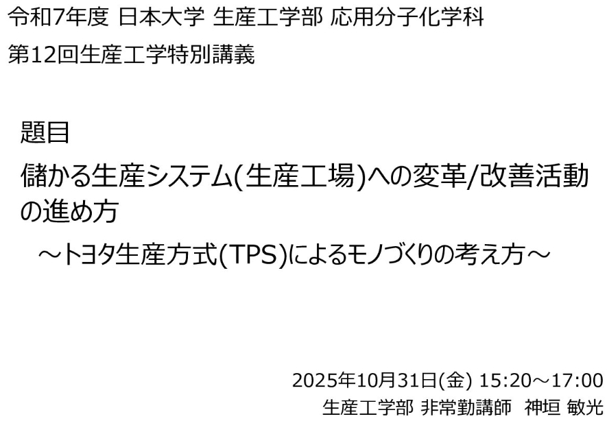 昨日10/31に日本大学で、生産工学特別講義を行いました。学生の反応は様々でしたが、儲かる生産システムへの改革/変革活動に対する興味を示す学生からの質問も多かったです。学生には、日本のモノづくり力を牽引してくれることを期待しています。 I gave a... -